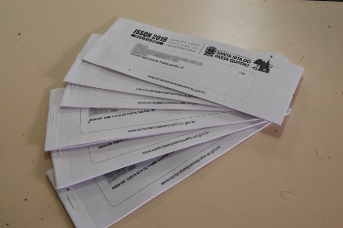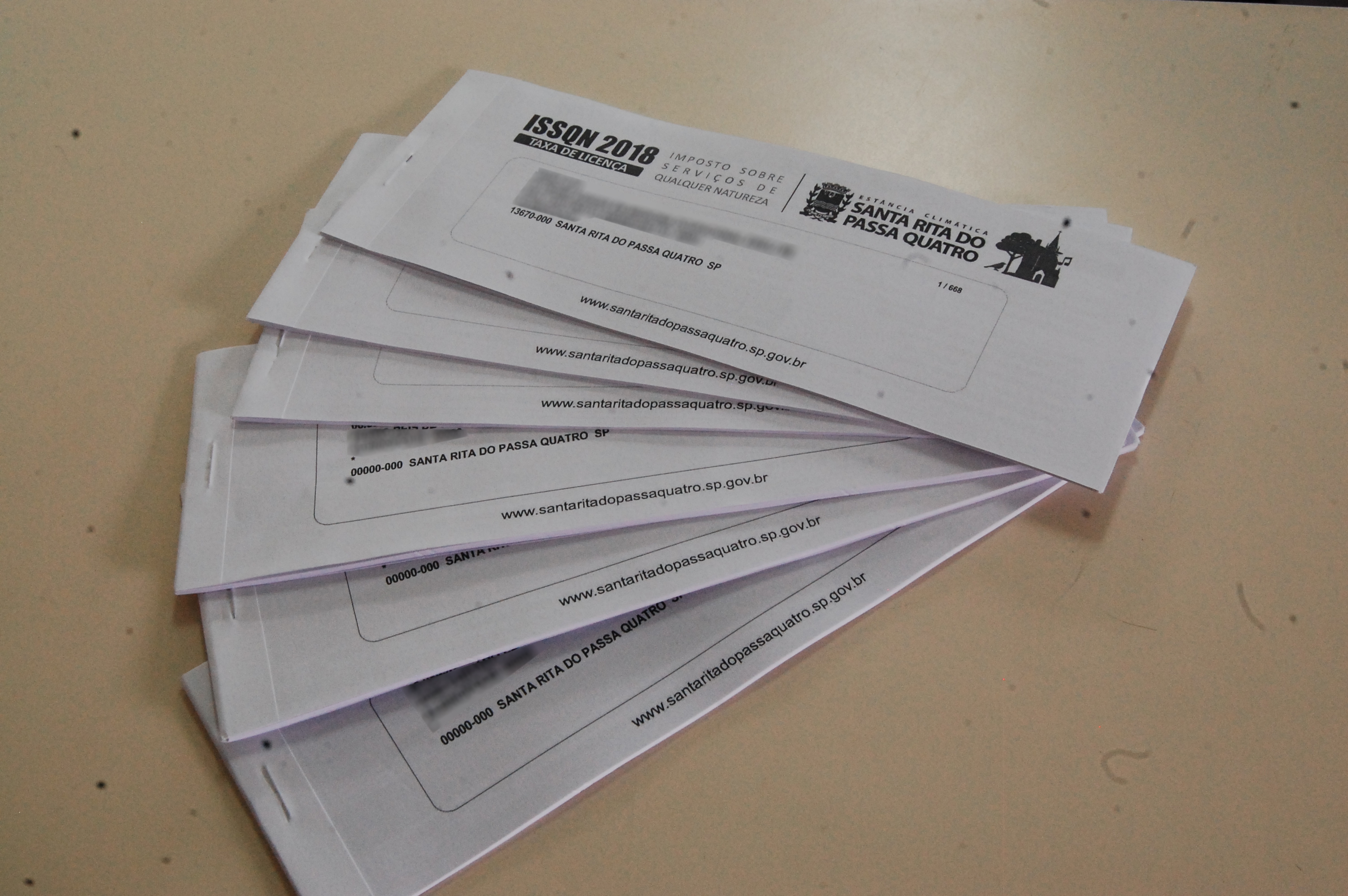 O setor de Tributação da Prefeitura Municipal de Santa Rita do Passa Quatro começou esta semana a distribuição dos carnês de IPTU (Imposto Predial e Territorial Urbano) e ISSQN (Imposto Sobre Serviços de Qualquer Natureza).