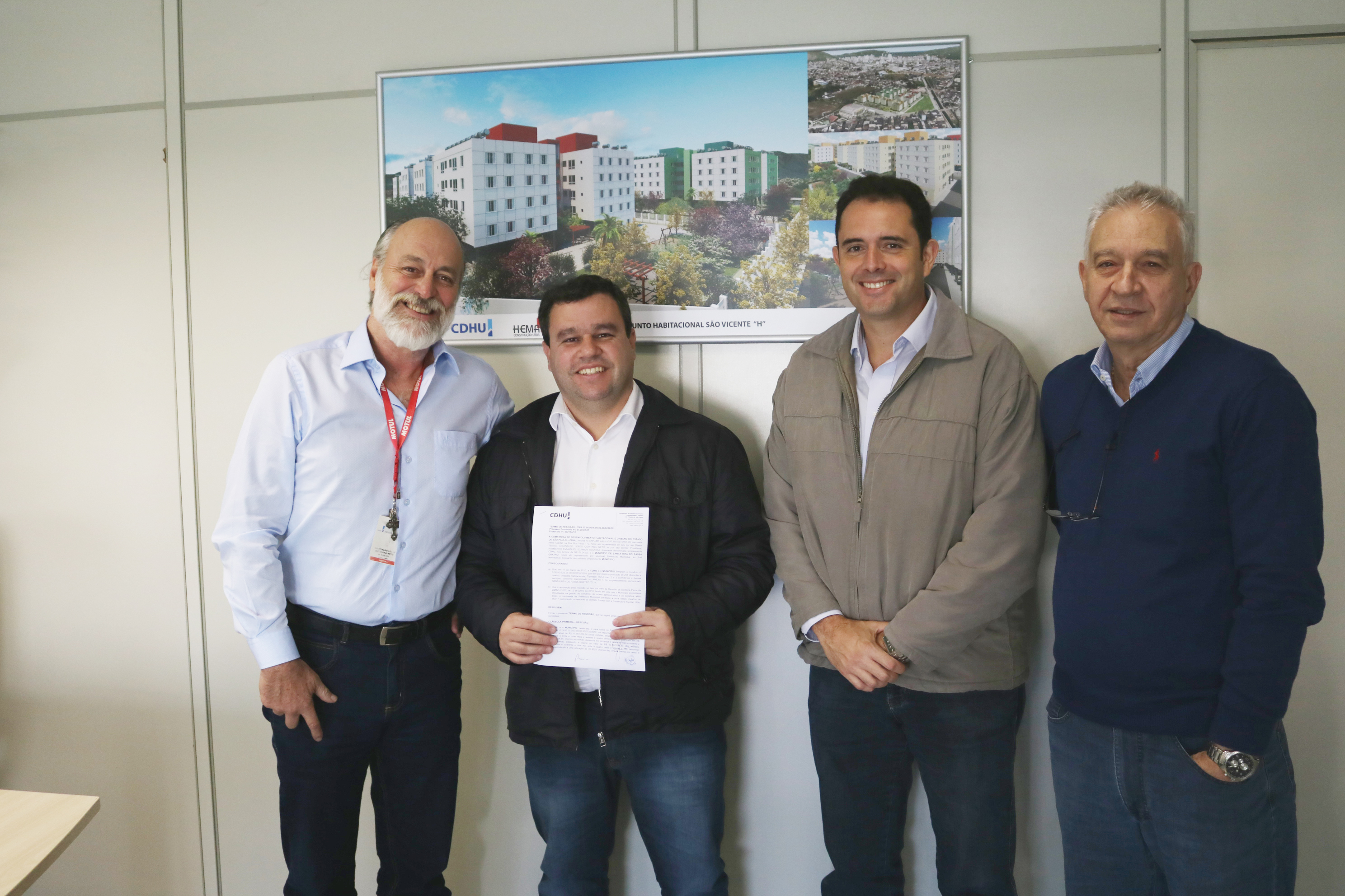 Na última segunda-feira (18/6) o prefeito Leandro Luciano dos Santos, acompanhado do diretor de Finanças da Prefeitura, Eduardo Giorgeli Gracioso, esteve na Secretaria de Habitação, em São Paulo, para assinatura da rescisão amigável de contrato, ação necessária para que a CDHU (Companhia de Desenvolvimento Habitacional e Urbano) possa abrir licitação e escolher a nova empresa que irá concluir as casas.