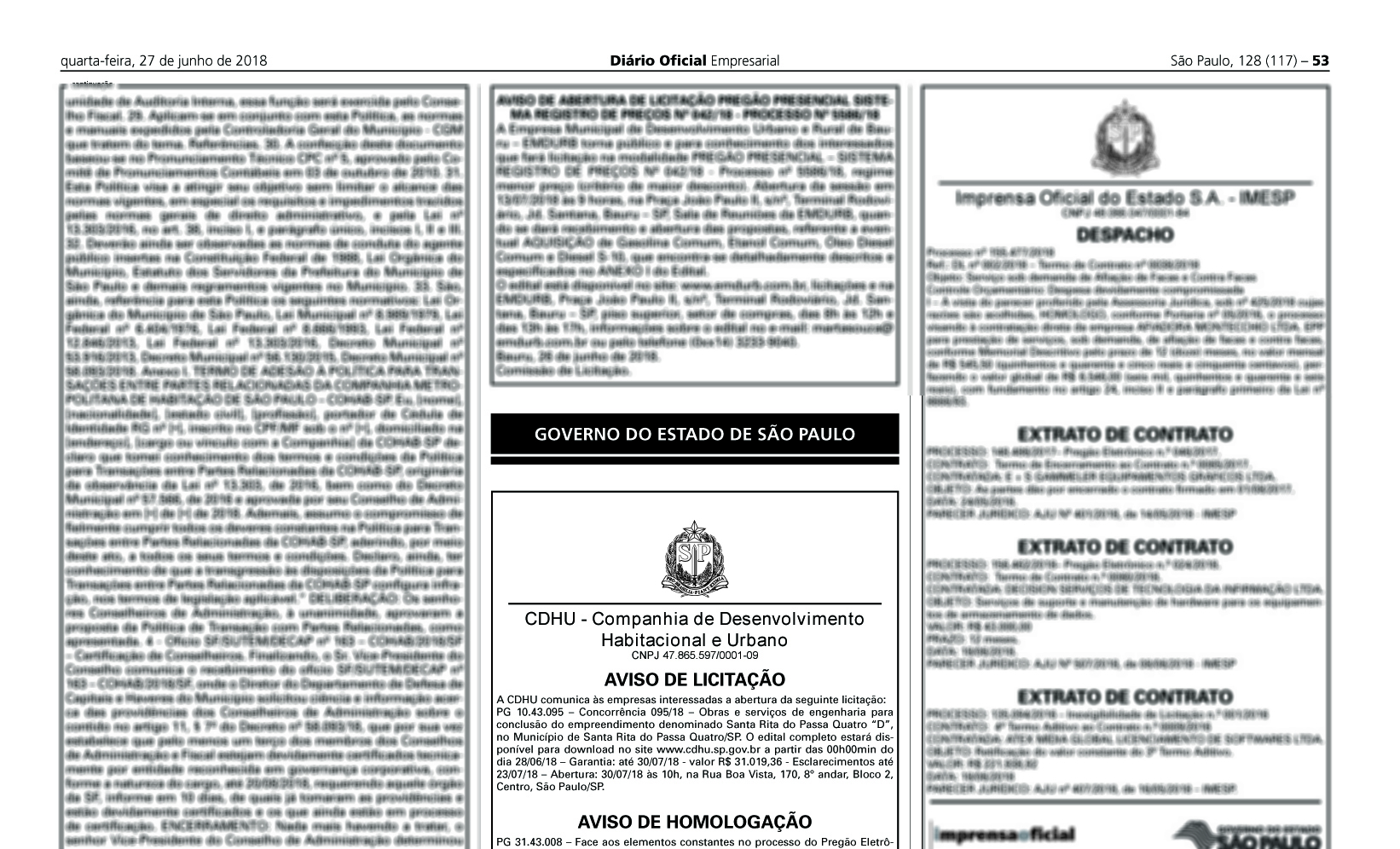 A CDHU (Companhia de Desenvolvimento Habitacional e Urbano) publicou nesta quarta-feira (27/6), no Diário Oficial do Estado de São Paulo, o Aviso de Licitação visando a contratação de nova empresa para irá concluir o Conjunto Habitacional do Santa Rita do Passa Quatro D (casas populares). As obras de construção das 205 casas foram abandonadas pela antiga construtora, no final de 2017, sem prévia comunicação à Prefeitura.