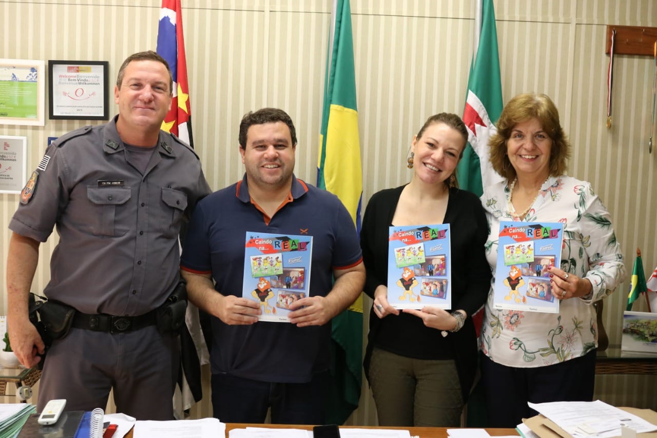 A assinatura aconteceu no gabinete do prefeito, que esteve acompanhado da vice-Prefeita, Maria Rita Mondin de Oliveira, da diretor do Departamento Municipal da Educação, Roberta Gracioso Borges Chefer, e do Instrutor do Proerd no município, Cabo PM Cassiano Samogin Júnior.