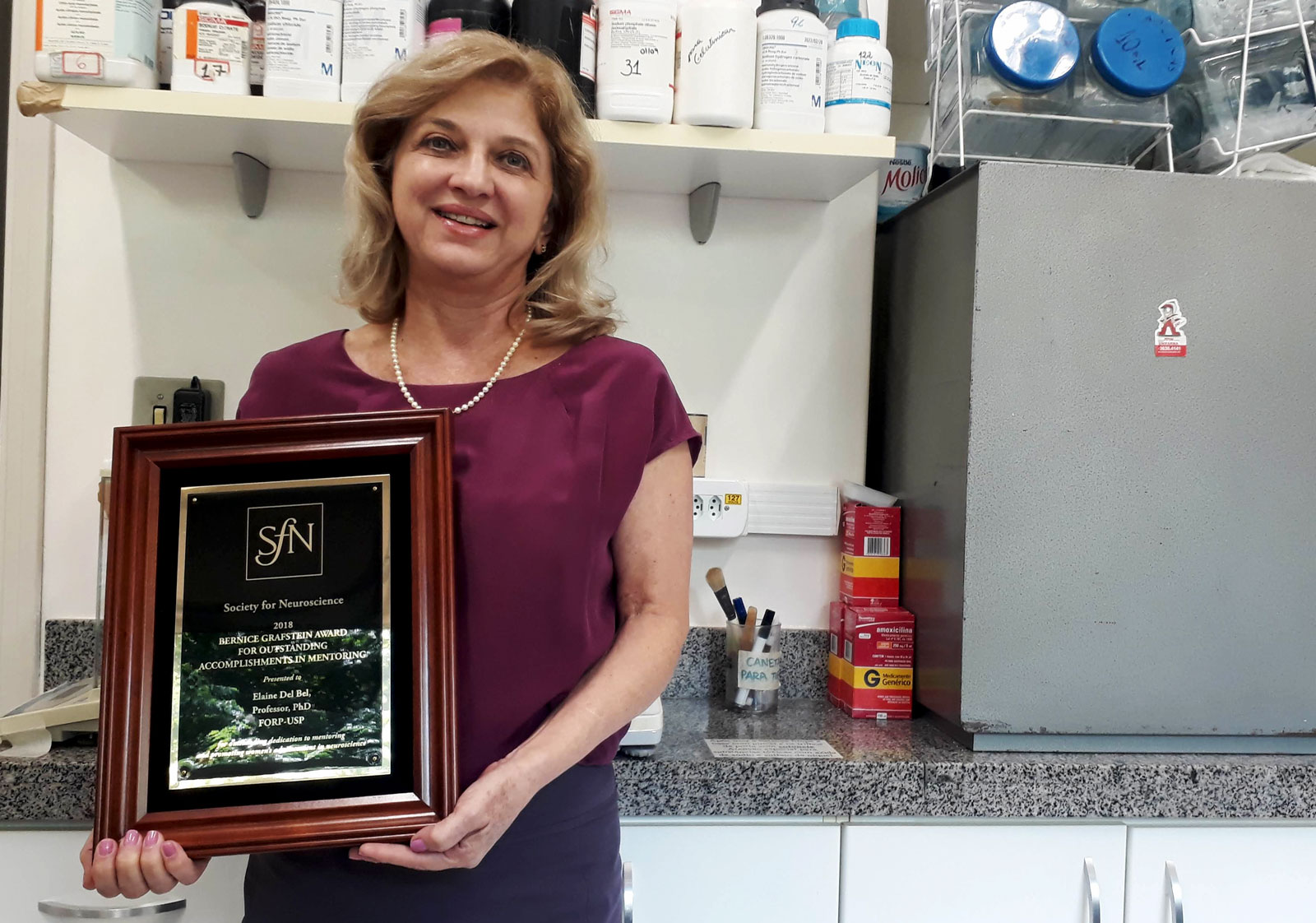 Hoje, ela é presidente da Federação de Sociedades de Neurociência da América Latina, do Caribe e na Península Ibérica (Falan).