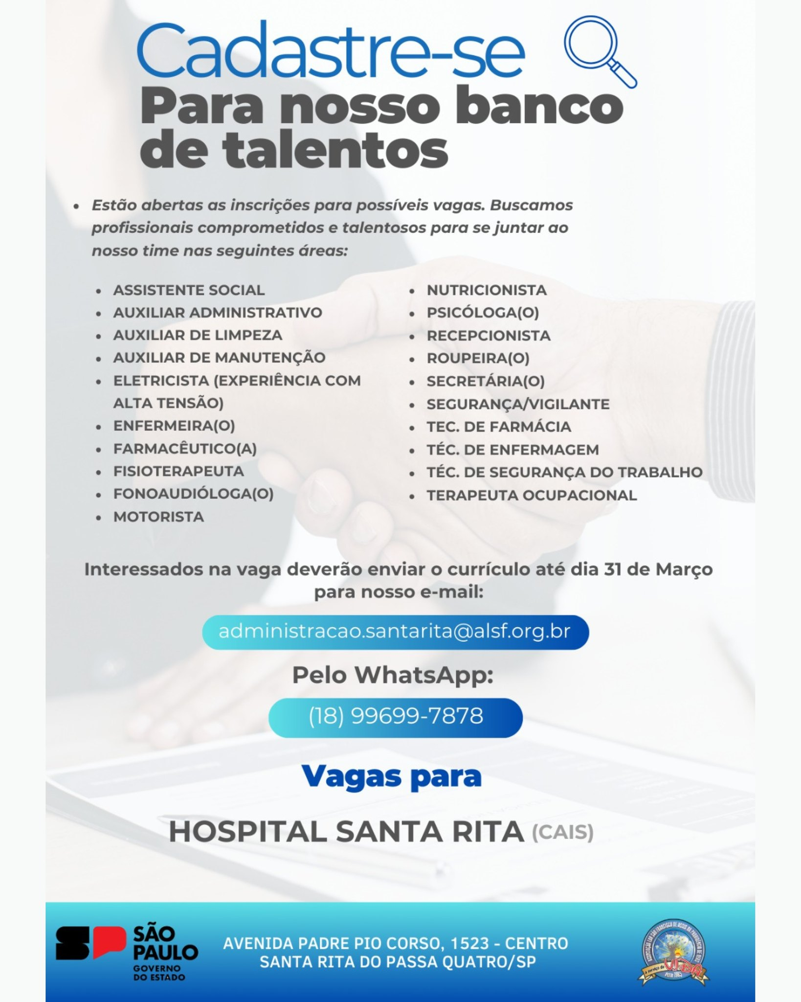 Importante: A Prefeitura Municipal de Santa Rita do Passa Quatro está apenas divulgando estas oportunidades e não é responsável pela seleção dos currículos e vagas. A contratação é de total responsabilidade da Associação e Fraternidade São Francisco de Assis na Providência de Deus, que está assumindo a Gestão do Hospital.