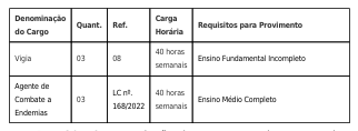 Art. 1º – Ficam criados e incluídos no Anexo II – Quadro Geral de Servidores Permanentes, que integra a Lei nº 1.820 de 20 de dezembro de 1989, as seguintes vagas ao cargo de provimento efetivo: Não temos informação sobre a forma de contratação para estes cargos, se será aproveitado um concurso já feito, ou se será aberto um novo concurso. Assim que tivermos a informação retornaremos ao assunto.