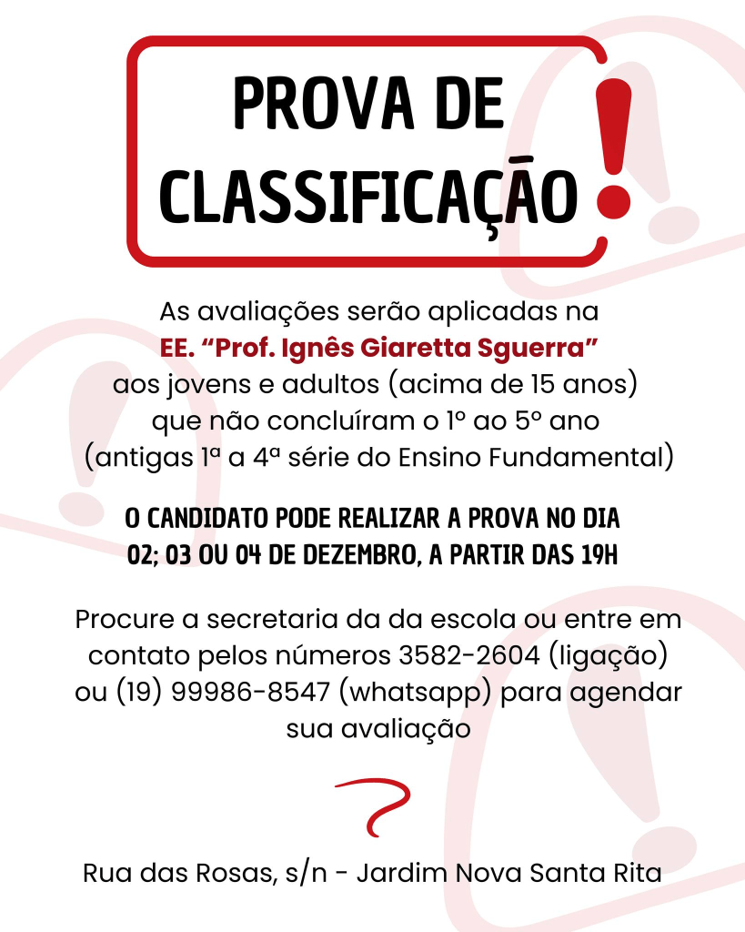 As avaliações serão aplicadas na EE. “Prof. Ignês Giaretta Sguerra” aos jovens e adultos (acima de 15 anos) que não concluíram o 1º ao 5º ano (antigas 1ª a 4ª série do Ensino Fundamental)