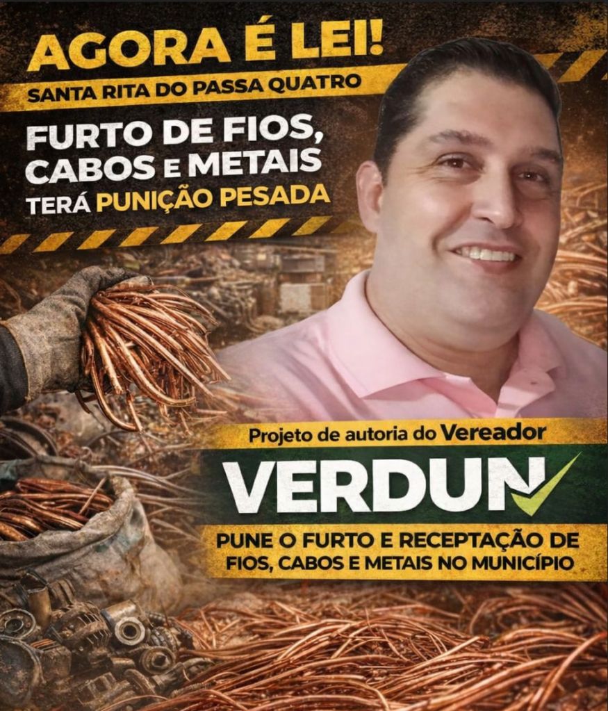 De iniciativa do Vereador e Presidente do Legislativo, Gilberto Bentlin Junior – Verdun, a Câmara Municipal de Santa Rita do Passa Quatro deu uma resposta firme a um dos problemas que mais afetam a segurança, os serviços públicos e o patrimônio da cidade. Em sessão no último dia 16, os vereadores aprovaram por unanimidade a Lei Municipal 4.221/2026, que endurece as medidas de combate ao furto e à receptação de fios, cabos e materiais metálicos de origem ilícita no município.